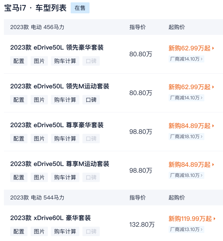界面新闻注意到,此次降价覆盖燃油车与新能源车型,主力产品降幅尤为显著。其中,顶级旗舰纯电车型i7M70L从189.9万元直降至159.8万元,成为降幅最大的车型;i7eDrive50L尊享型降价18万元,从116.9万元降至98.8万元;7系燃油版735Li从91.9万元降至80.8万元,740Li领先型从106.9万元降至93.8万元,降幅均约12%。