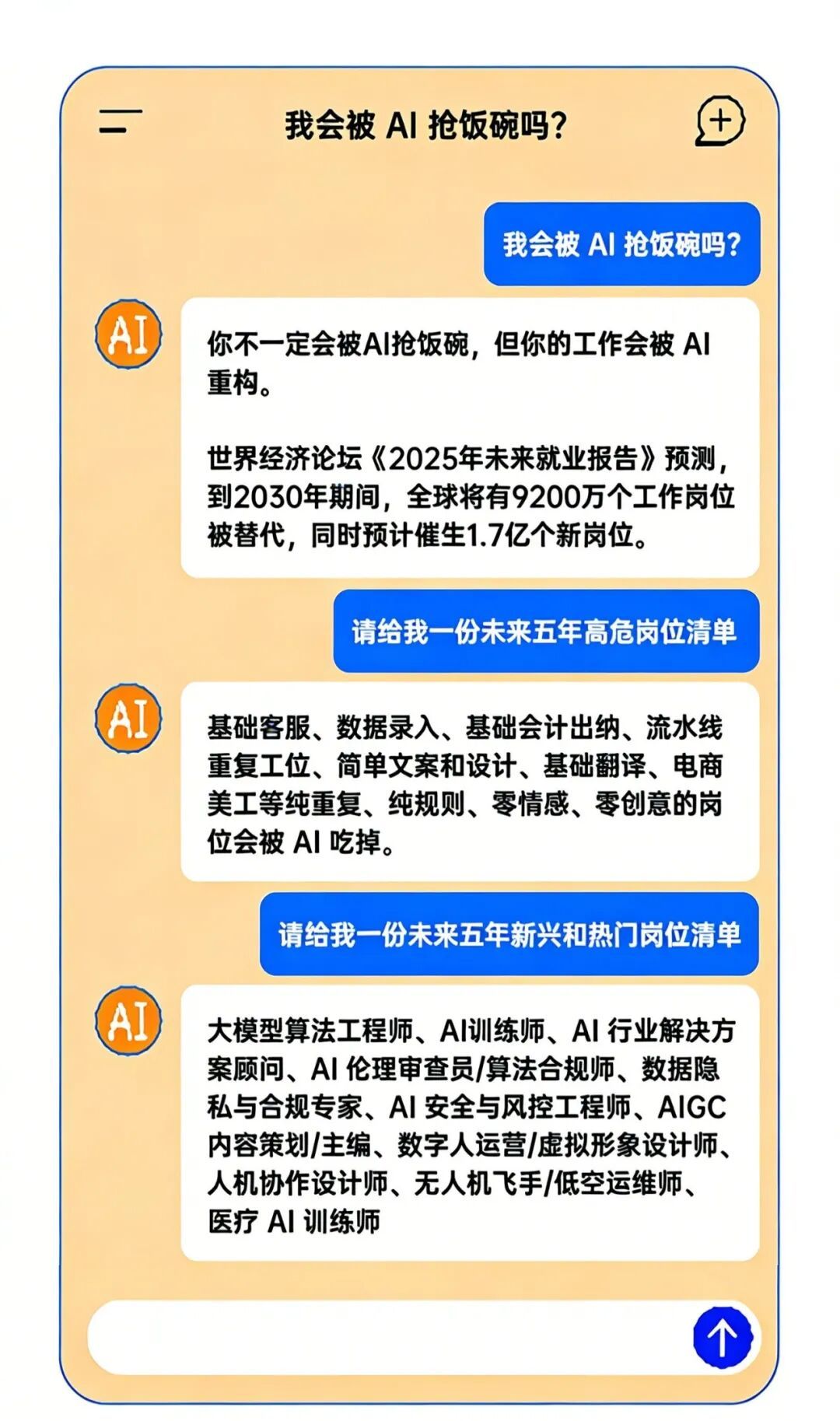 基础客服、数据录入、基础会计出纳、流水线重复工位、简单文案和设计、基础翻译、电商美工等纯重复、纯规则、零情感、零创意的岗位会被 AI 吃掉。